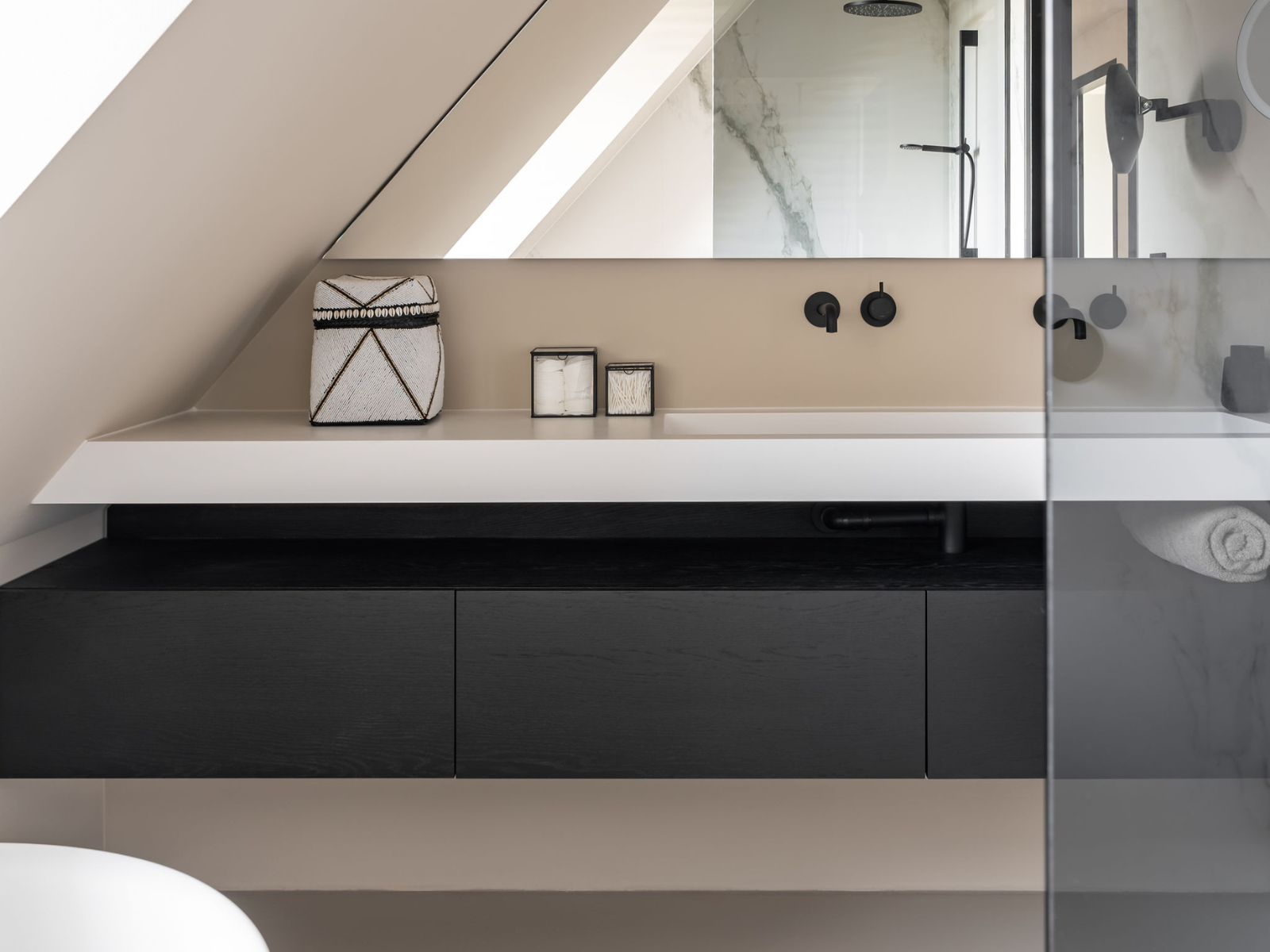 Het Badkamermeubel Grou is een luxe, zwevend designmeubel met een opvallende openruimte van 20 cm tussen de bovenkant van het meubel en de onderkant van het wastafelblad. Ideaal om handdoeken of accessoires neer te leggen, terwijl de push to open lades zorgen voor een strak, greeploos uiterlijk.