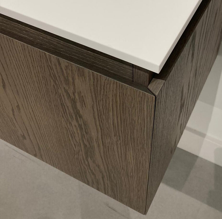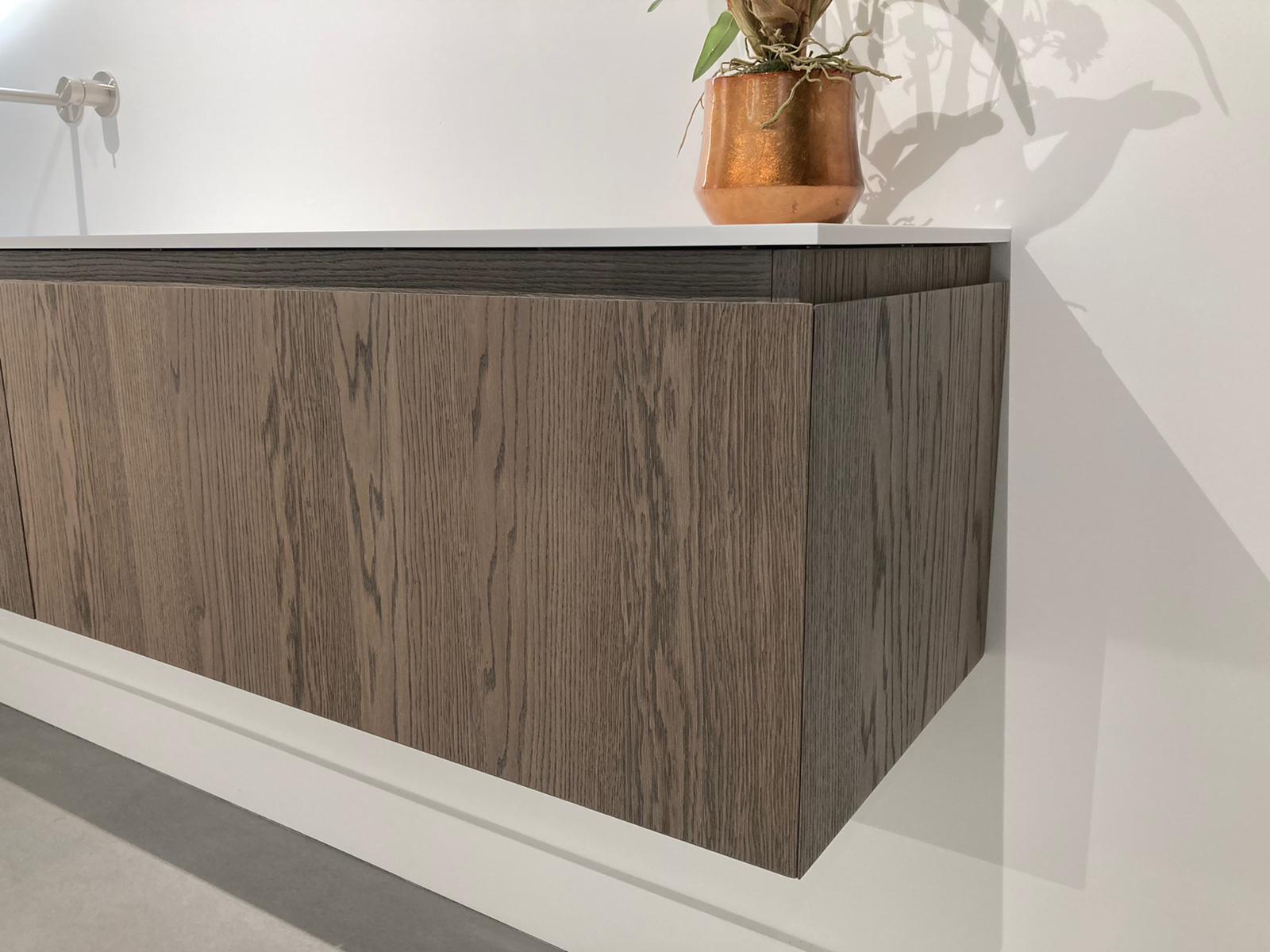 Het onderscheidende kenmerk van model IJzendijke is de verstekgreep die niet alleen in het ladefront, maar ook in de zijwanden is doorgetrokken. Hierdoor ontstaat rondom – aan de voor- én zijkanten – een 3 cm ruimte tussen de bovenkant van het ladefront en de onderkant van de wastafel. Dit geeft het meubel een minimalistisch en luchtig karakter, waarbij de wastafel lijkt te zweven boven het meubel.