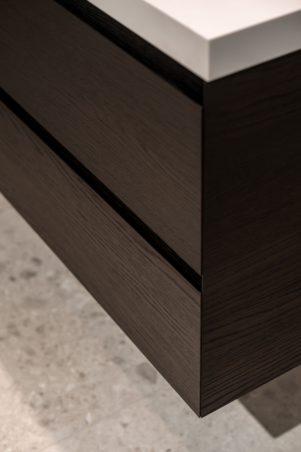 Het Badkamermeubel Sneek met dubbele ladelagen is een modern, zwevend badkamermeubel designmeubel met kenmerkende 45° verstekdetails. Met een hoogte van 56 cm biedt het royale opbergruimte, zonder dat dit ten koste gaat van de strakke uitstraling.