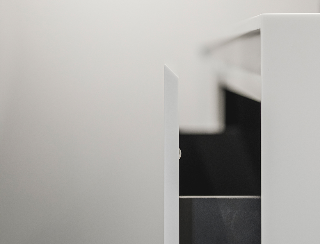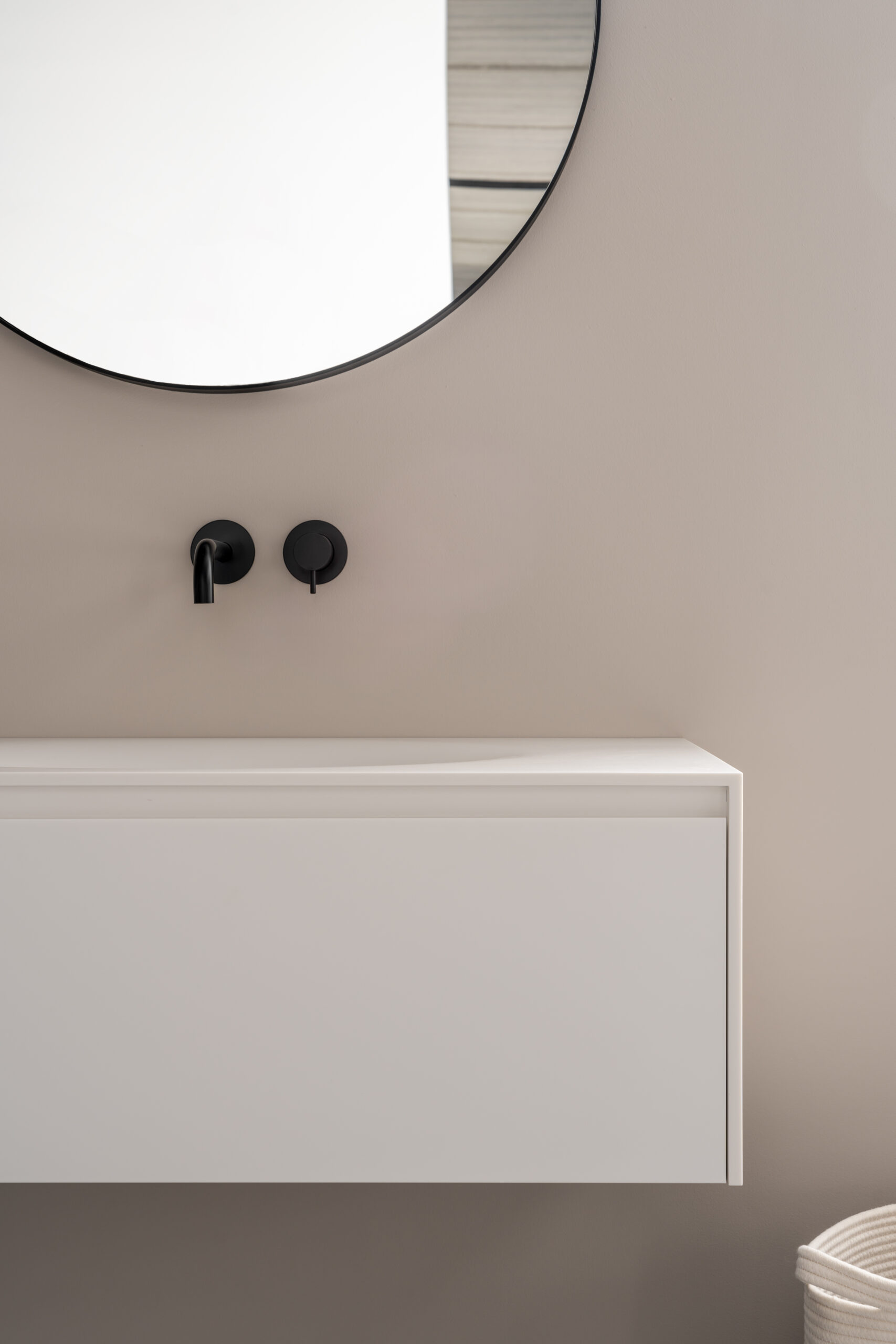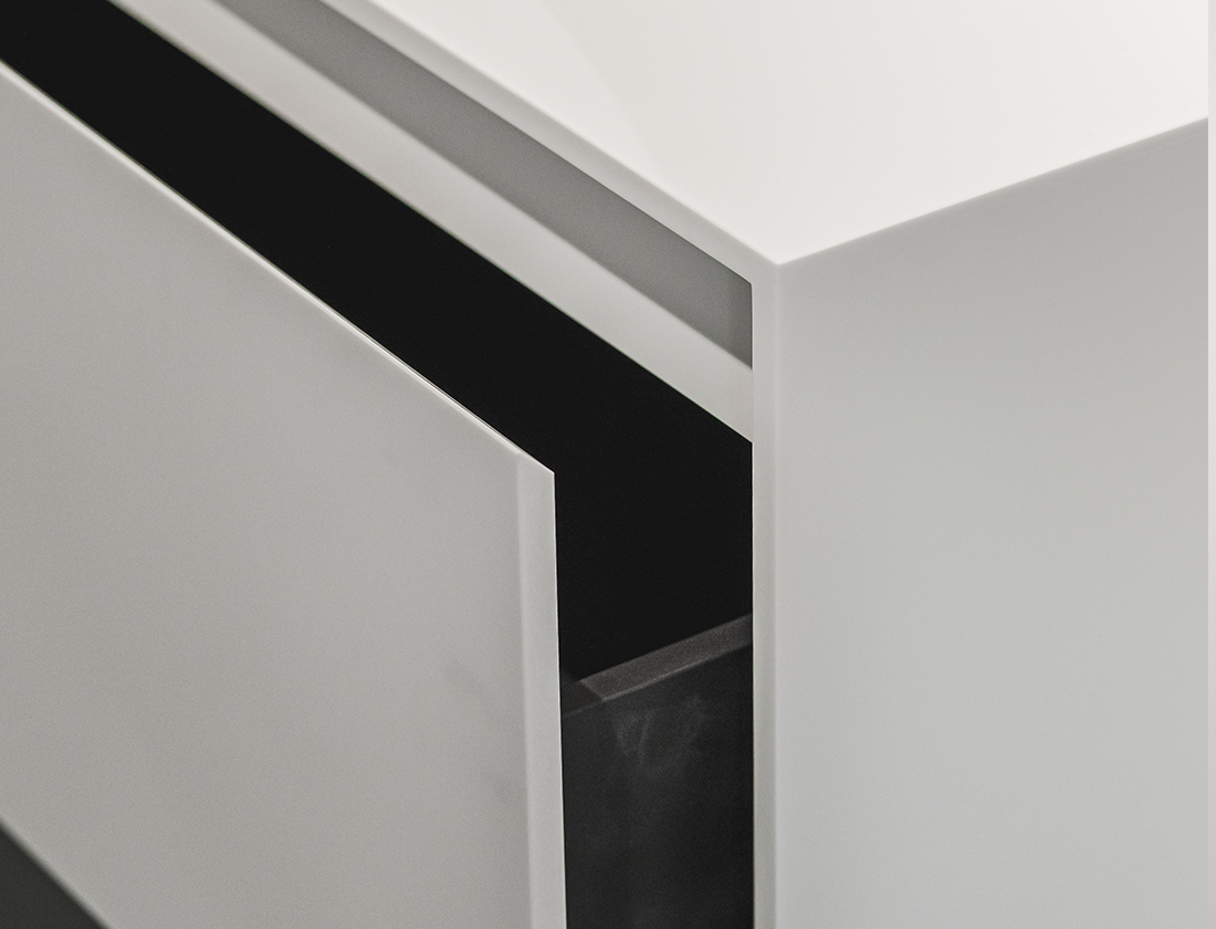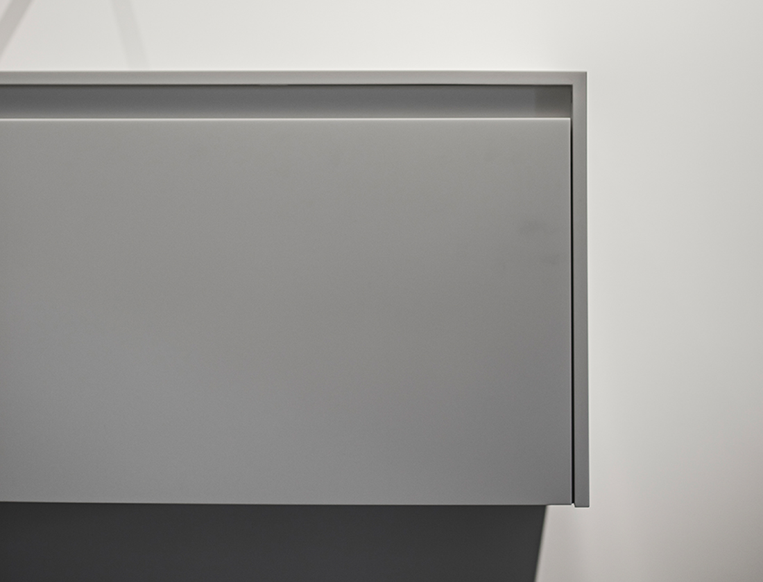 De ladefronten en zijwanden zijn uitgevoerd in Solid Surface, verkrijgbaar in Corian® of Hi-Macs®, waardoor meubel en wastafel één geheel vormen. Het resultaat: een minimalistisch, tijdloos design met een premium uitstraling.