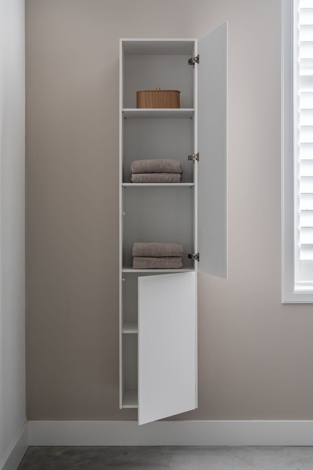 De badkamerkast Franeker is een elegant en functioneel meubel dat zorgt voor extra opbergruimte in de badkamer, terwijl het strakke design perfect past bij een moderne inrichting. Wat deze kast bijzonder maakt, is de naadloze afwerking en minimalistische uitstraling, waardoor de kast een stijlvolle en praktische toevoeging is aan elke badkamer.