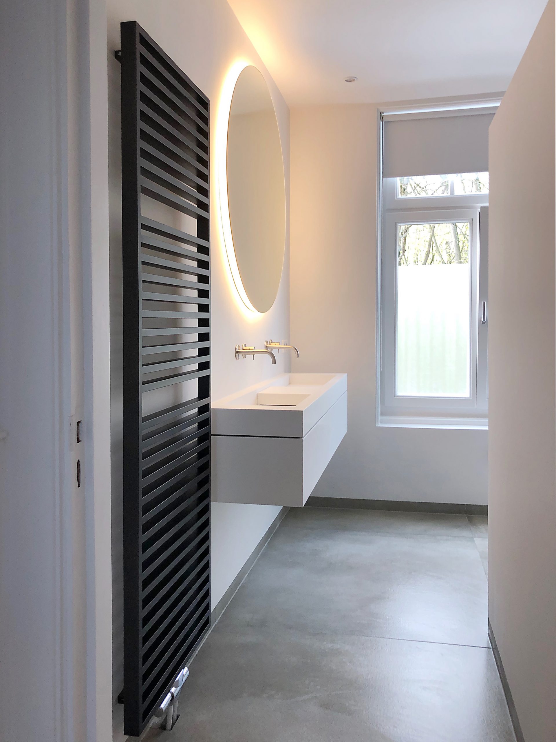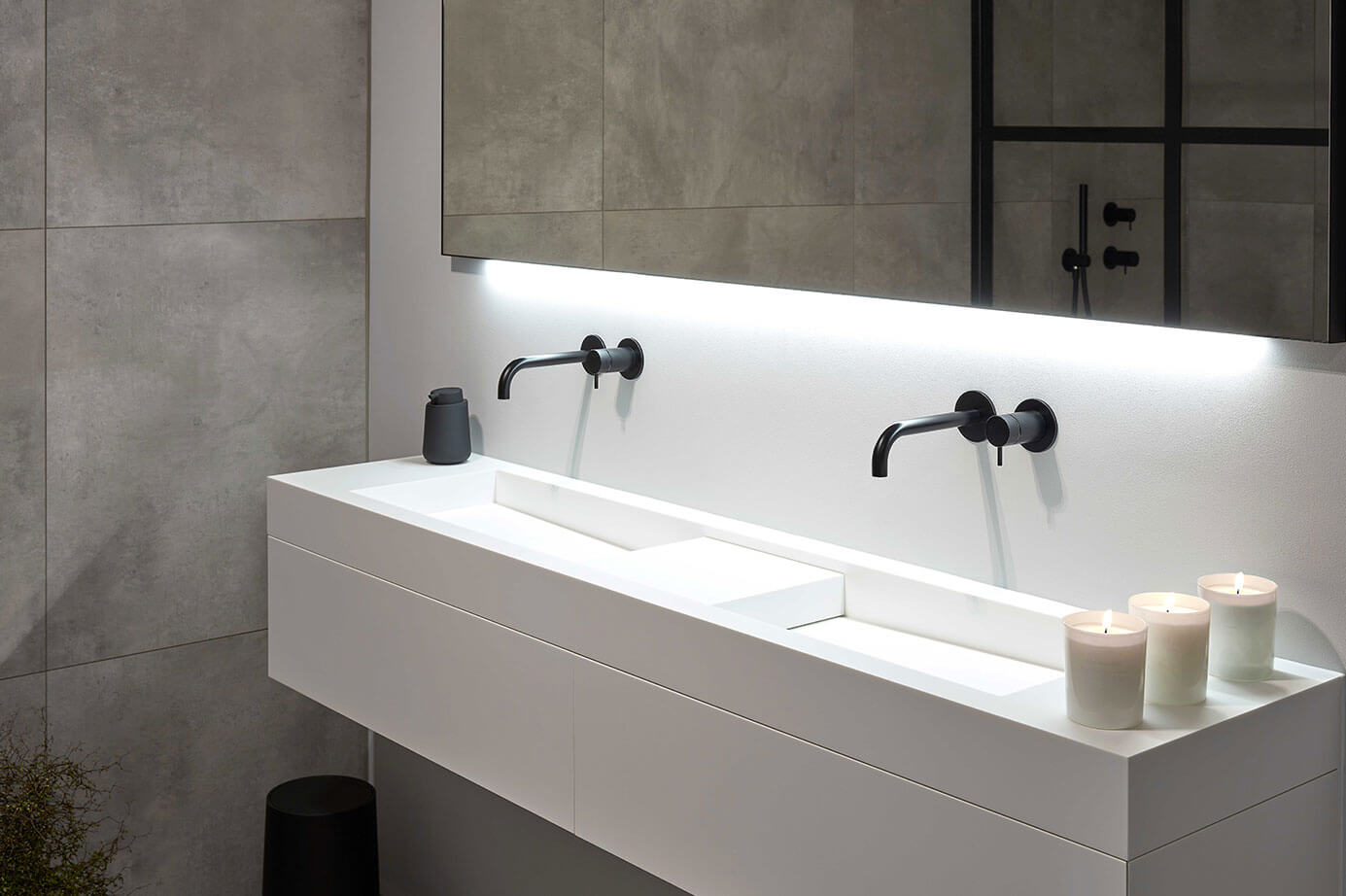 De dubbele Cadzand-wastafel wordt geleverd in breedtes vanaf 120 cm tot 370 cm. Daarbij bepaal je zelf de positie van de wasbak(ken) in het blad, zodat de wastafel altijd aansluit bij jouw badkamerindeling en gebruiksgemak.