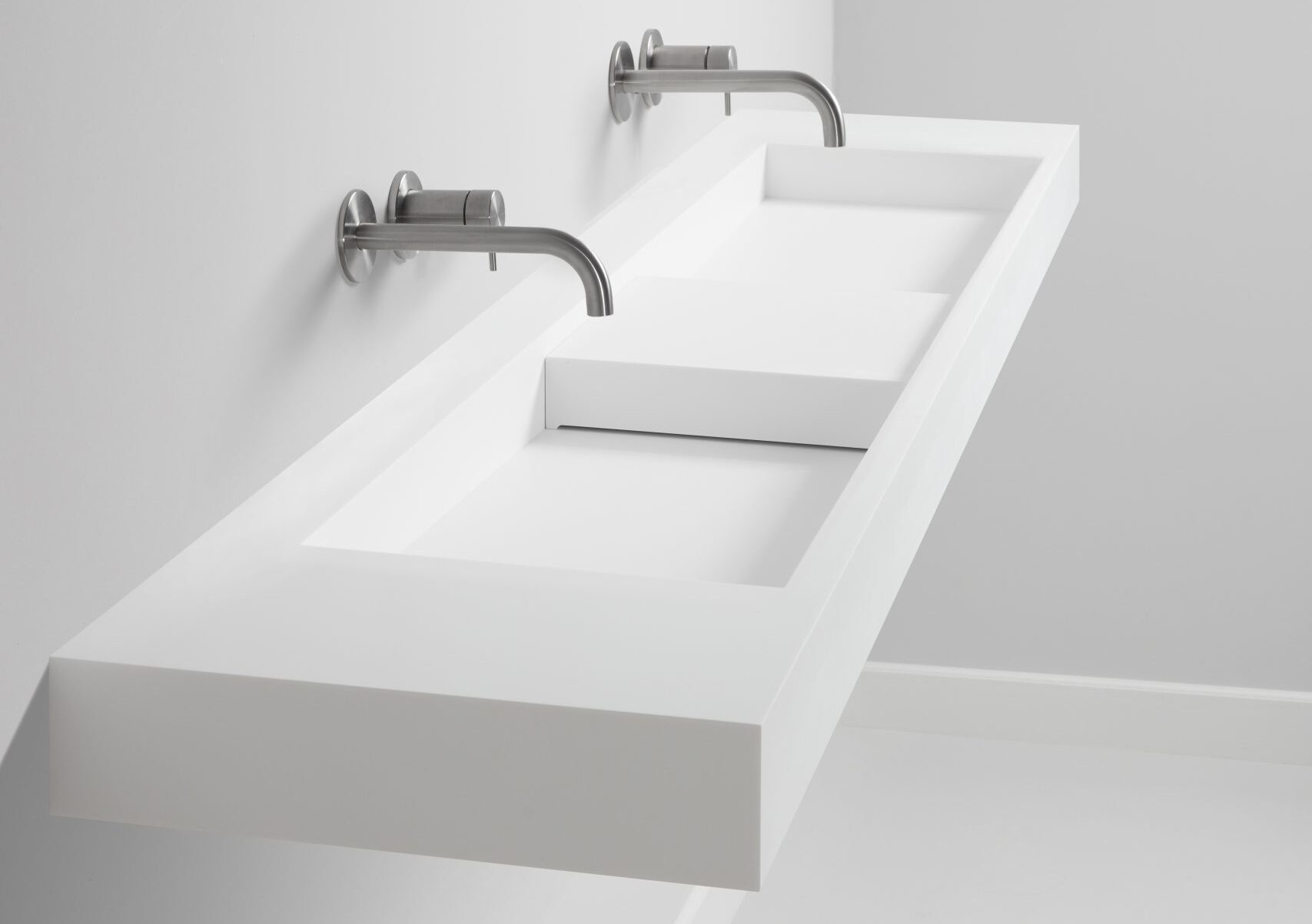 De Solid Surface Wastafel Cadzand is een bijzondere dubbele wastafel die uitblinkt door zijn unieke ontwerp. De bodem loopt vanaf beide zijkanten schuin naar beneden naar het midden, waar een uitneembaar plateau ligt. Onder dit plateau is de afvoer netjes weggewerkt, wat zorgt voor een strak en minimalistisch geheel. Het plateau ligt licht verdiept in de wasbak en voegt een verfijnd detail toe. De Cadzand is leverbaar vanaf 120 cm tot maar liefst 370 cm breed, waardoor hij perfect geschikt is voor zowel compacte als royale badkamers.