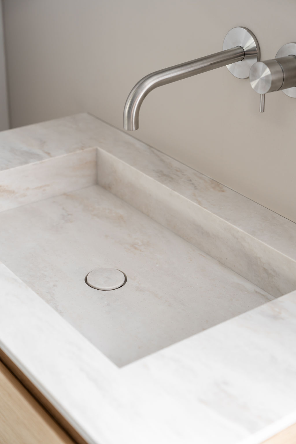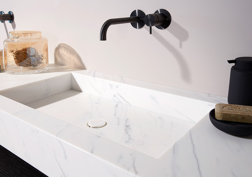 Zo geniet je van de elegante uitstraling van marmer of travertin, met het gebruiksgemak en de hygiëne van Solid Surface.